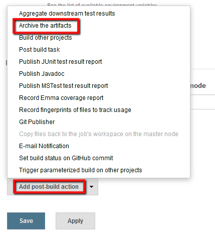 At the bottom of the configuration screen add a ‘Post Build Action’ to ‘Archive the artifacts’