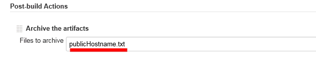 Next we need to get this ‘publicHostname.txt’ file back from the workspace area on the linux slave to the workspace on the Jenkins master machine and archive the file. To do this we just use the in built build step to ‘Archive the artifacts’ post build action.