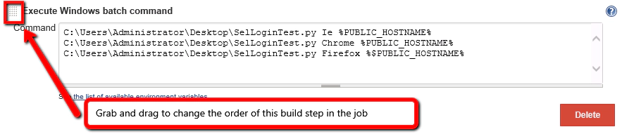 All we need now is for the part of the job that runs the selenium tests to use this hostname. For that we just edit the existing ‘Windows Batch Command’ changing it from: