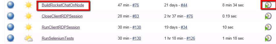 Save the changes you’ve made to the job and return to the Jenkins home page. Run the ‘BuildRocketChatOnNode’ job which will then trigger the ‘RunClientRDPSession’ job follwed by the ‘RunSeleniumTests’ job automtically.
