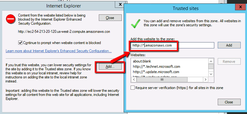You may find the first Selenium test against IE failed. This will probably be down to the trusted sites setup in IE. In which case you’ll want to define the amazonaws.com domain as a trusted site so the ‘warning message’ doesn’t stop the execution. You can do this on these dialogue boxes: